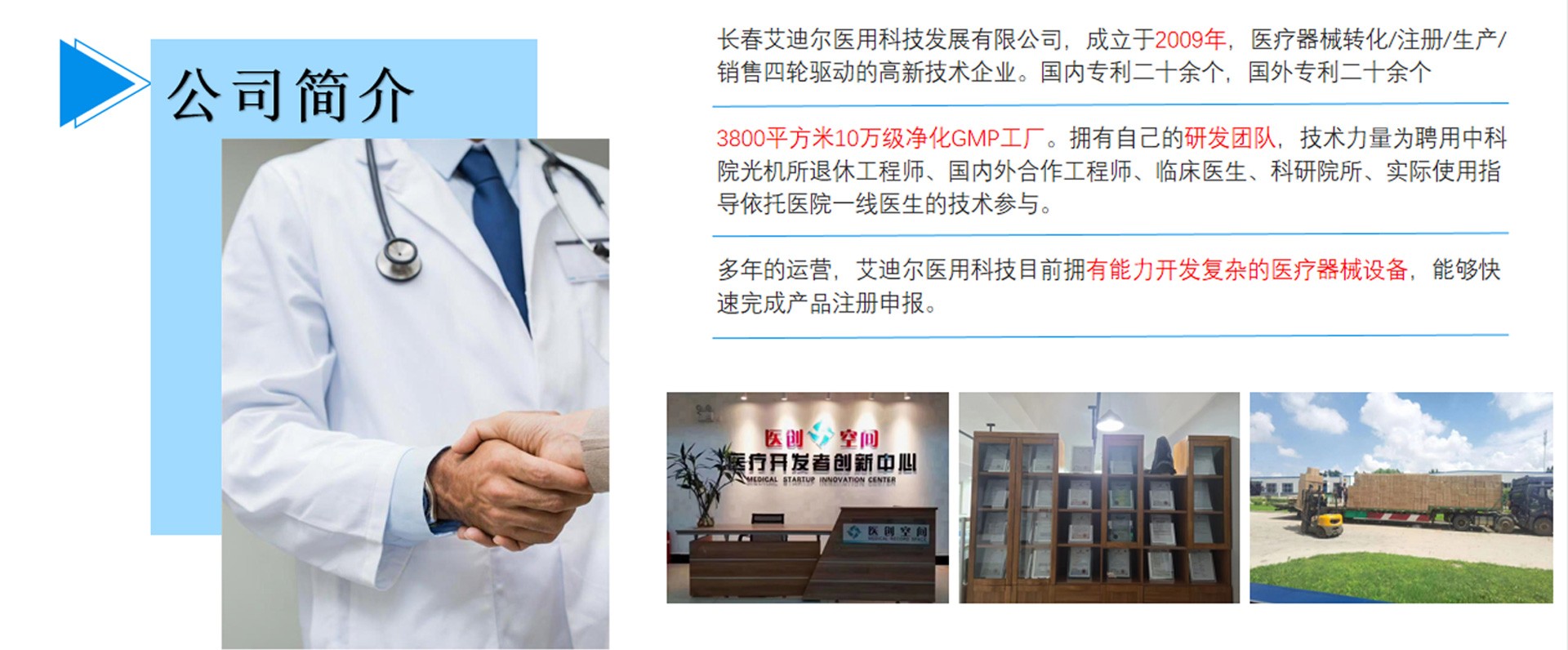 長春艾迪爾醫用科技發展有限公司為集產(自有工廠); 學(多所院校科研課題合作單位);研(研發成果轉化注冊)三位一體的高新技術企業。艾迪爾科技主要經營范圍為一次性醫療器械耗材的開發,專注于抗菌肽新材料的開發和研制,以“IN-58抗菌肽一類新藥及原料藥注冊、激光類治療儀”兩個核心優勢技術為中心。公司擁有標準GMP車間及健全的質量管理體系,擁有多個已上市和即將上市的產品,包括睡眠、泌尿、口腔、肝膽、消殺、婦科六大系列產品線。公司擁有核心專業技術報批團隊,承接國內外醫療器械專項成果轉化,具備自主研發能力及MAH服務能力。